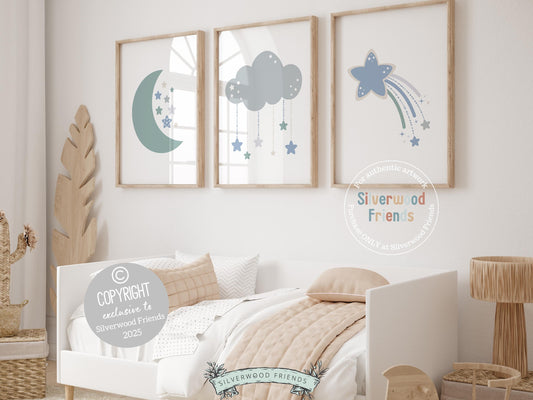 Cloud Moon Stars Nursery Prints - Sage Green, Blue, Grey