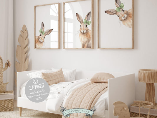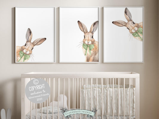 Peeking Bunny Nursery Prints - Green Bow Tie