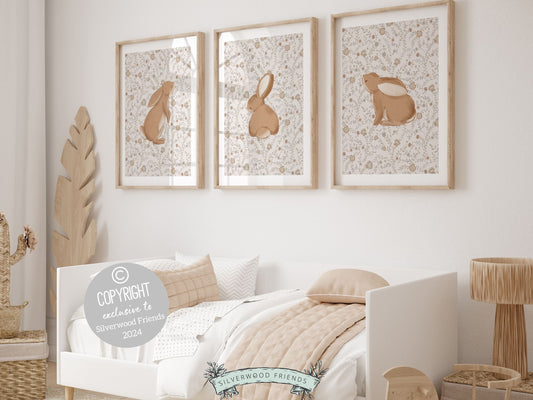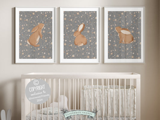 Brown Wildflower Bunnies Nursery Print Set