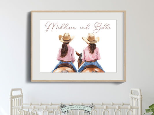 Custom Cowgirl Sisters Horse Nursery Print - 001