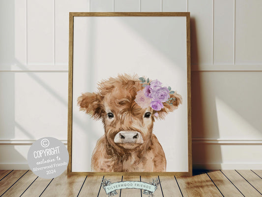 Purple Floral Highland Cow Nursery Print