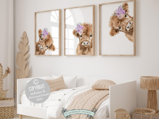 Purple Floral Peeking Highland Cow Nursery Prints