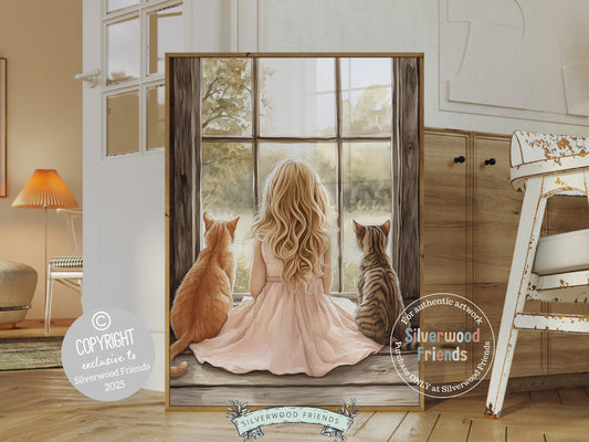 Little Girl Tabby Cat Barn Nursery Print - 001