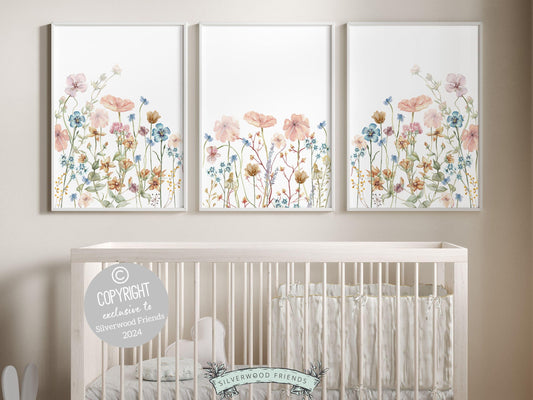 Pink Blue Wildflower Nursery Prints - Set of 3