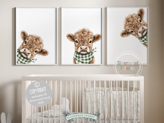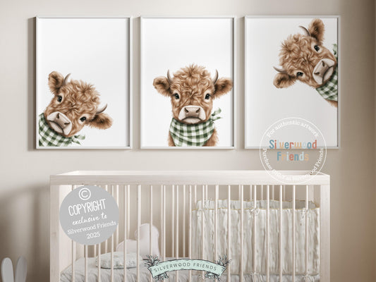 Sage Green Peeking Highland Cow Bandana Nursery Prints - 001