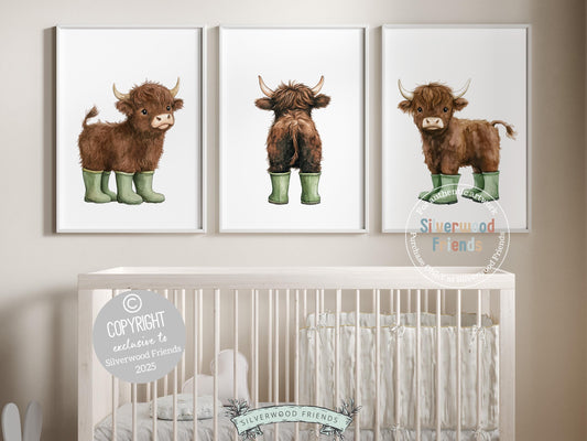 Highland Cow In Boots Nursery Prints - Green Boots 002