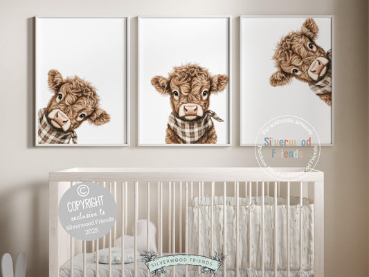 Neutral Peeking Highland Cow Bandana Nursery Prints - 001