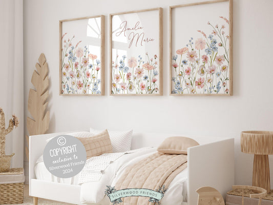 Pink Blue Wildflower Nursery Wall Art Set of 3