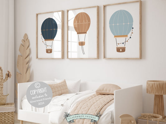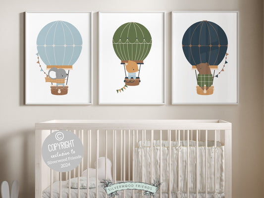 Green Hot Air Balloon Nursery Prints - Set of 3