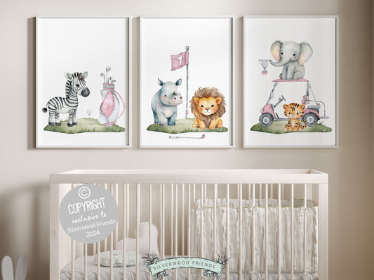 Girls Pink Golf Nursery Prints - Safari Animals