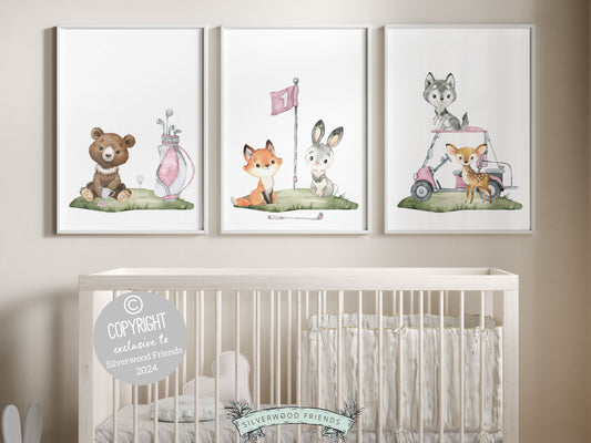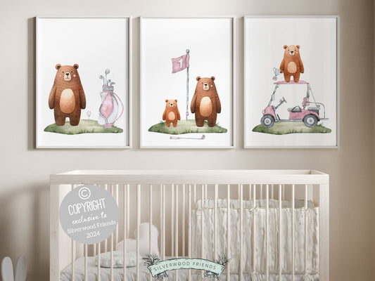 Girls Pink Golf Nursery Prints - Woodland Bears
