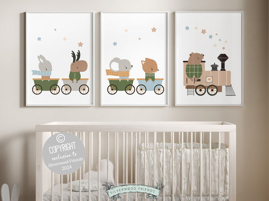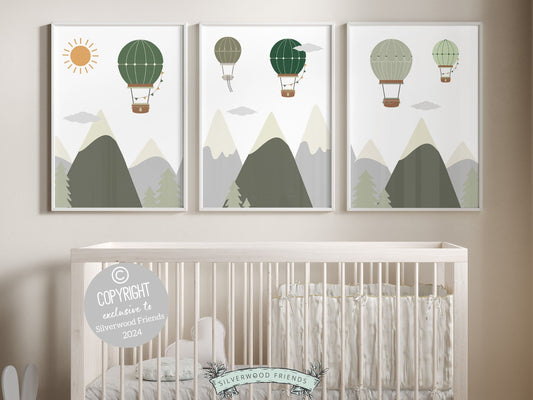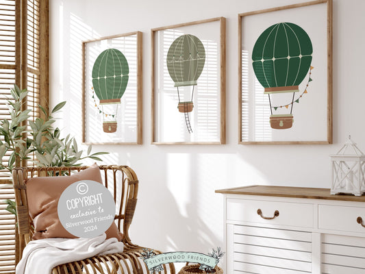 Green Hot Air Balloon Nursery Prints - Set of 3