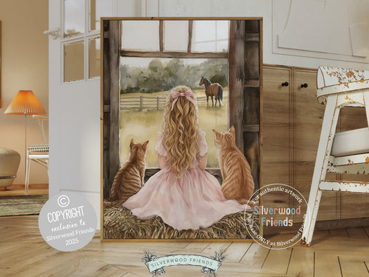 Little Girl Tabby Cat Barn Nursery Print - 002