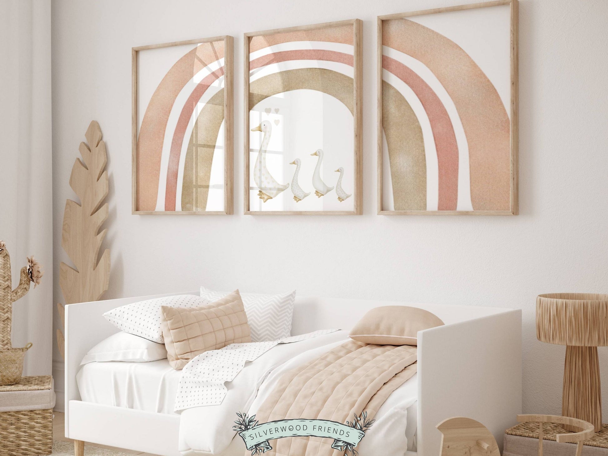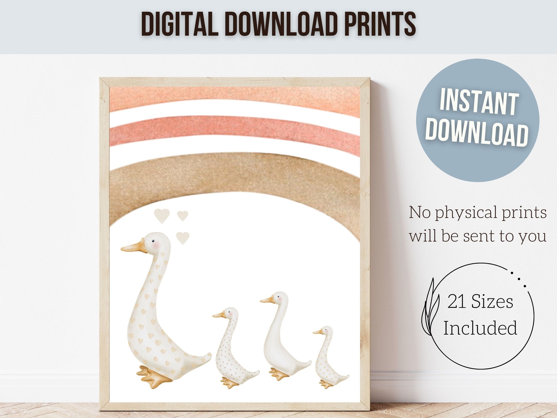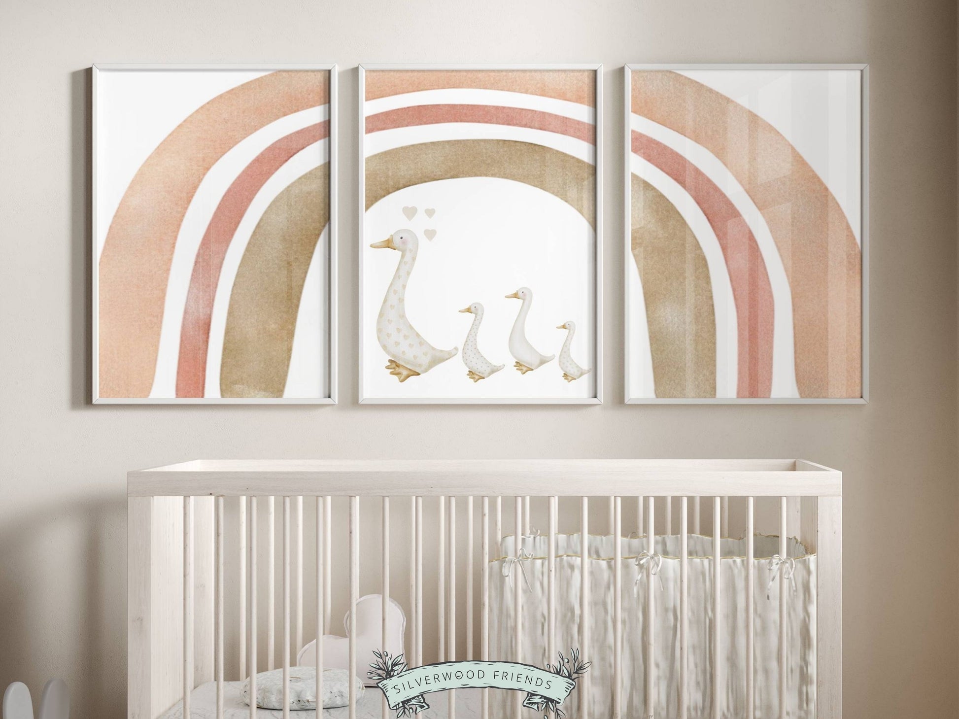 Our gorgeous Duck Nursery Prints with watercolour rainbow, duck and ducklings, is the perfect nursery print set for your boho nursery decor, and also makes a lovely baby shower gift.